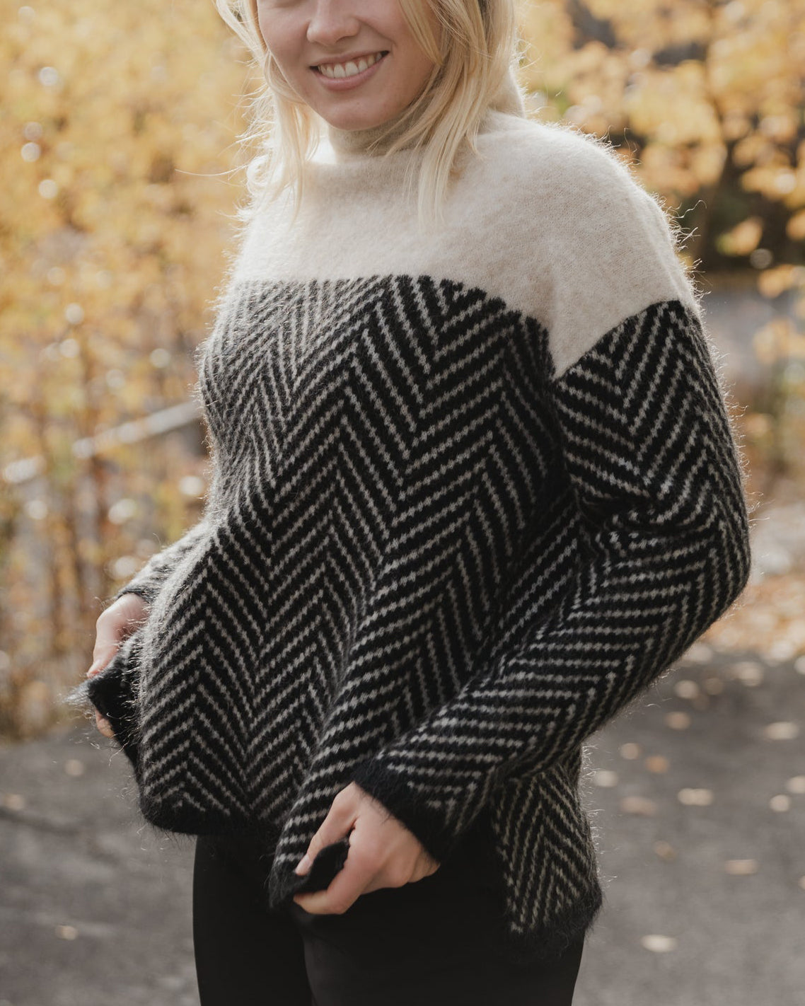 Esta blusa presenta un llamativo patrón de espiga que añadirá un toque especial a los looks de clima frío. Con un cuello alto para mantenerte cómodo y hombros caídos para un ajuste relajado, combinará bien con pantalones y faldas.