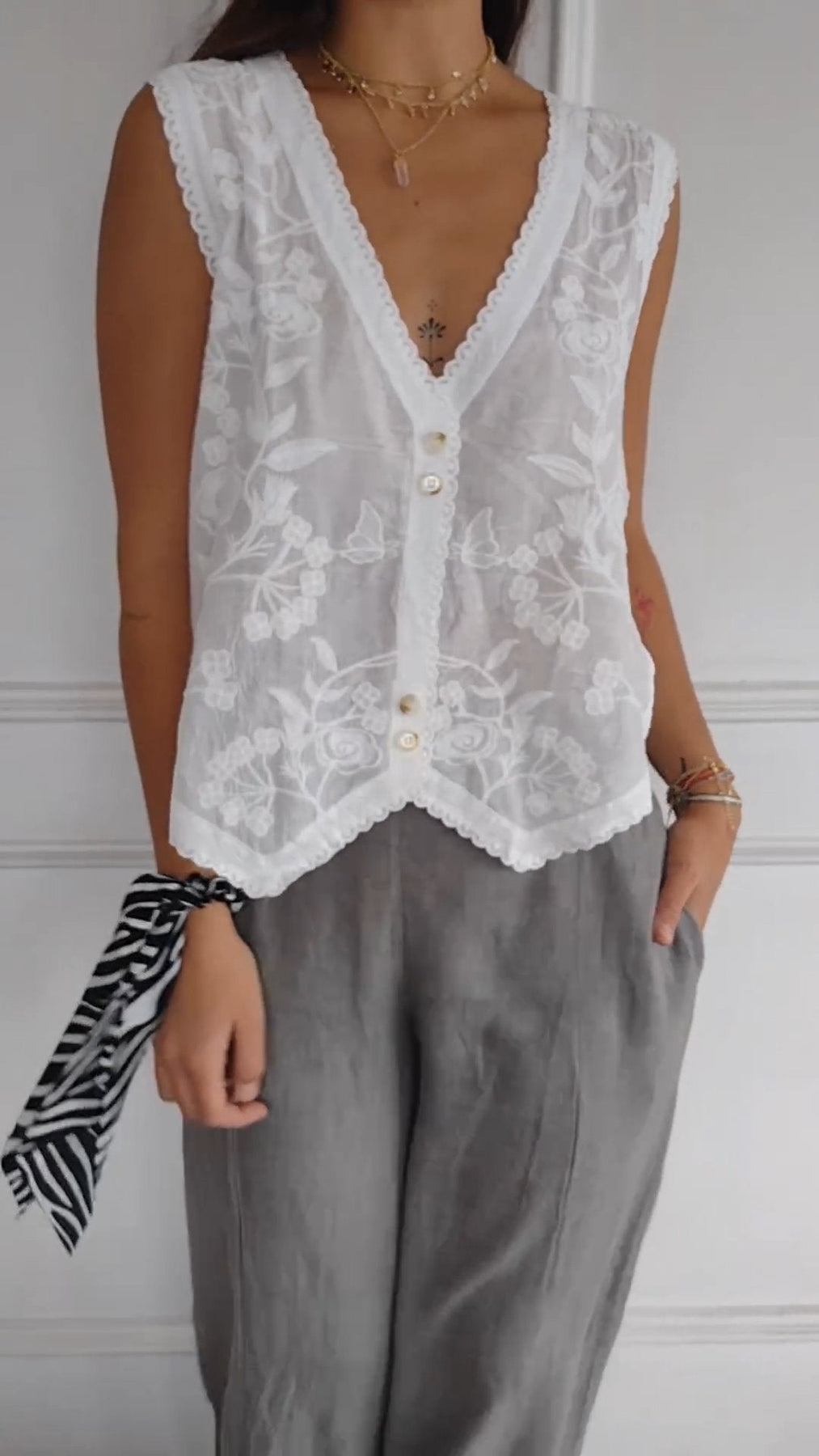 La camiseta está confeccionada en tul ligero y transpirable, con bordados delicados que añaden un toque especial. El escote en V realza el escote con elegancia, mientras que los botones frontales ofrecen un encanto extra y practicidad.