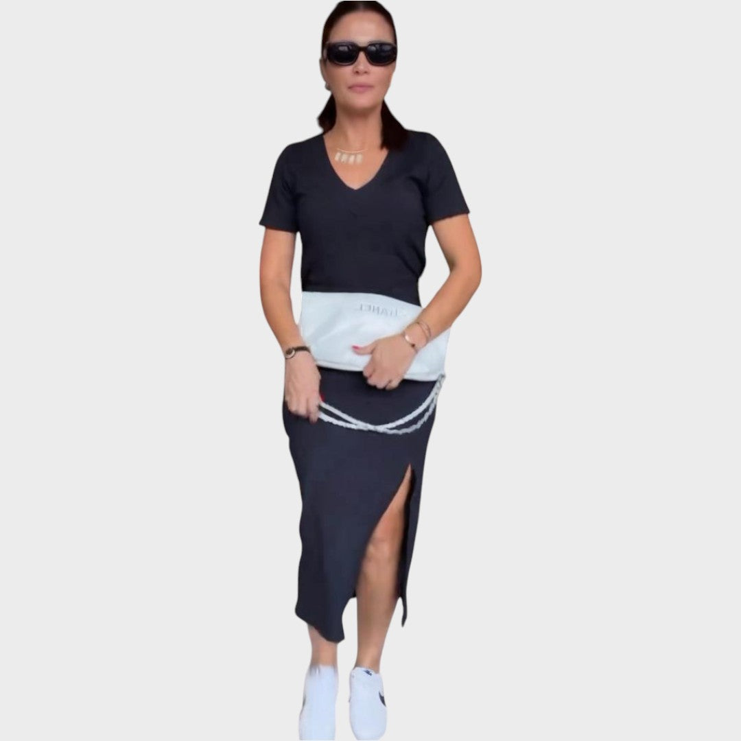 El conjunto Aria combina elegancia y comodidad en un look moderno y versátil. Compuesto por un top con escote en pico y una falda midi de talle alto, este conjunto se adapta perfectamente a una gran variedad de ocasiones, desde eventos informales hasta salidas más sofisticadas. El detalle del cordón de ojal en la cintura garantiza un ajuste elegante y femenino, mientras que el tejido de tacto suave proporciona una comodidad total.