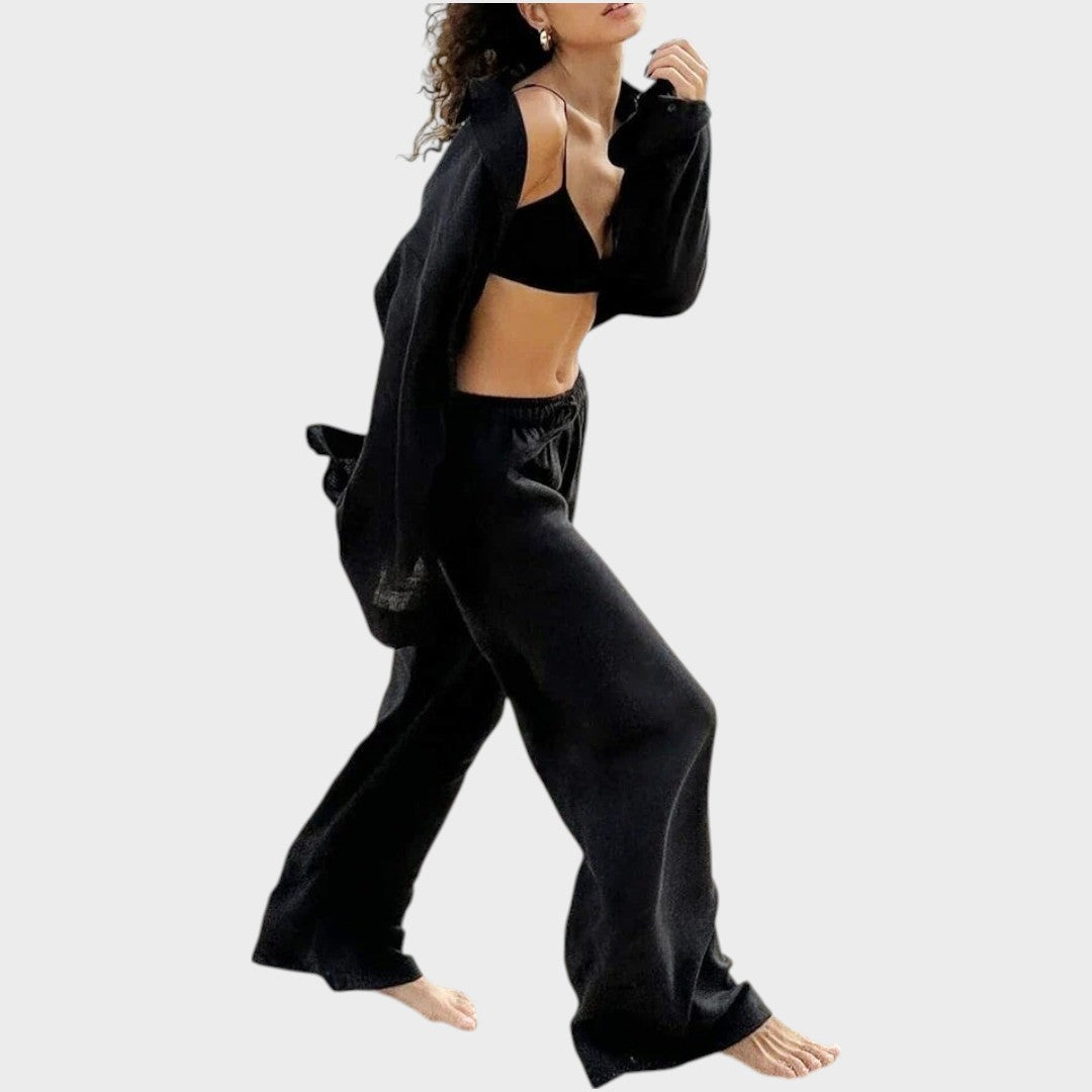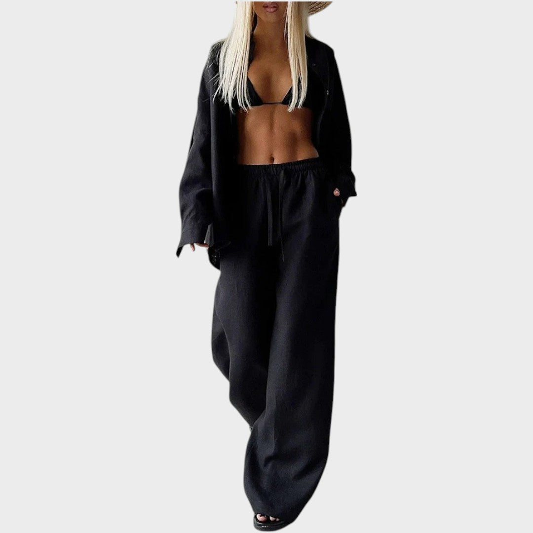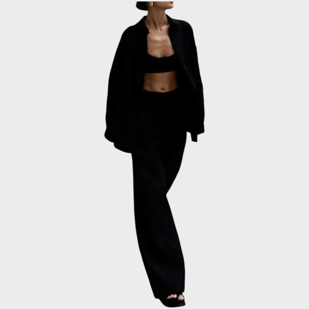 Descubre el conjunto Luna en algodón de primera calidad: una camisa oversize a rayas, un versátil cropped top y unos pantalones de cintura alta y pierna ancha. Cada pieza tiene un corte ligero y un tacto suave, combinando comodidad y elegancia en un look urbano que combina con tu estilo. Perfecta para pasar del día a la noche con autenticidad y frescura.