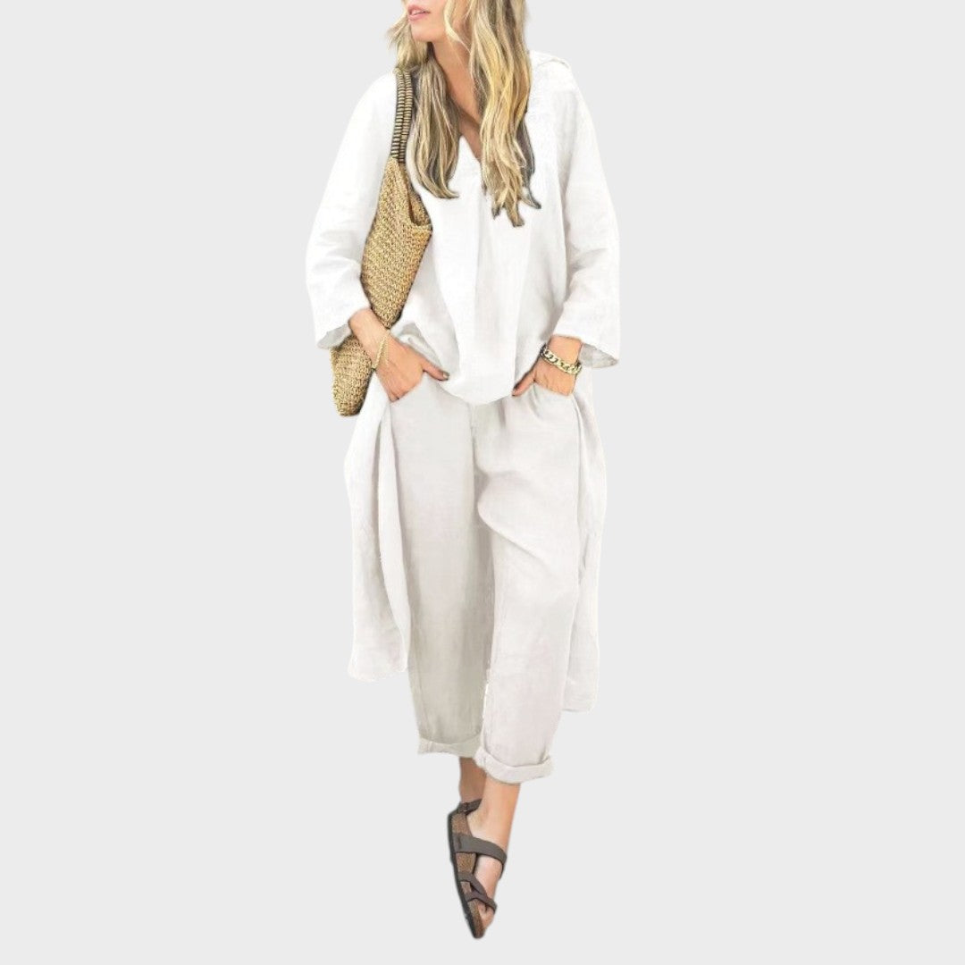 Ya sea para mañanas frescas o paseos en la hora dorada, este vibrante conjunto está hecho para seguir el ritmo. El top holgado de cuello en V y los pantalones anchos combinan la transpirabilidad del algodón y el cáñamo con la fluidez, ofreciendo estilo y comodidad durante todo el día en una silueta llamativa.