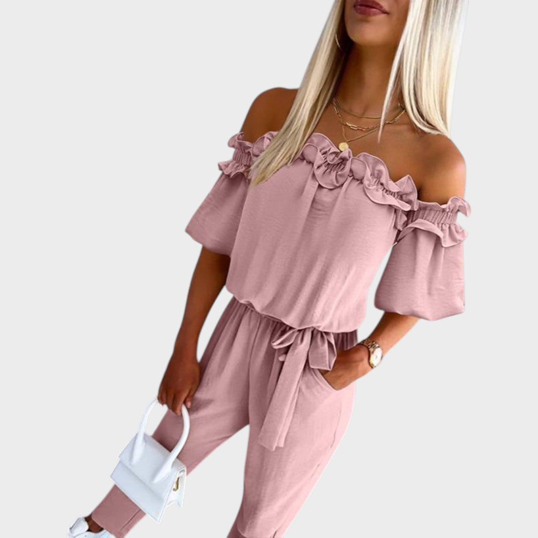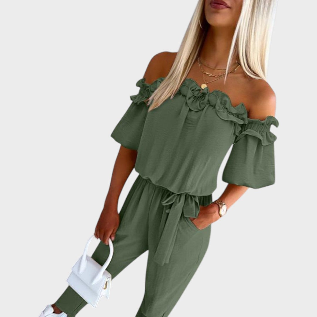 Apuesta por un estilo desenfadado con Joana, el mono con volantes y lazo en la cintura, que combina elegancia y comodidad para el día a día. Con su seductor escote de hombros descubiertos y su cintura estilizada, esta versátil prenda es perfecta para cualquier ocasión: llévala con tacones o con sandalias para un look relajado y soleado.