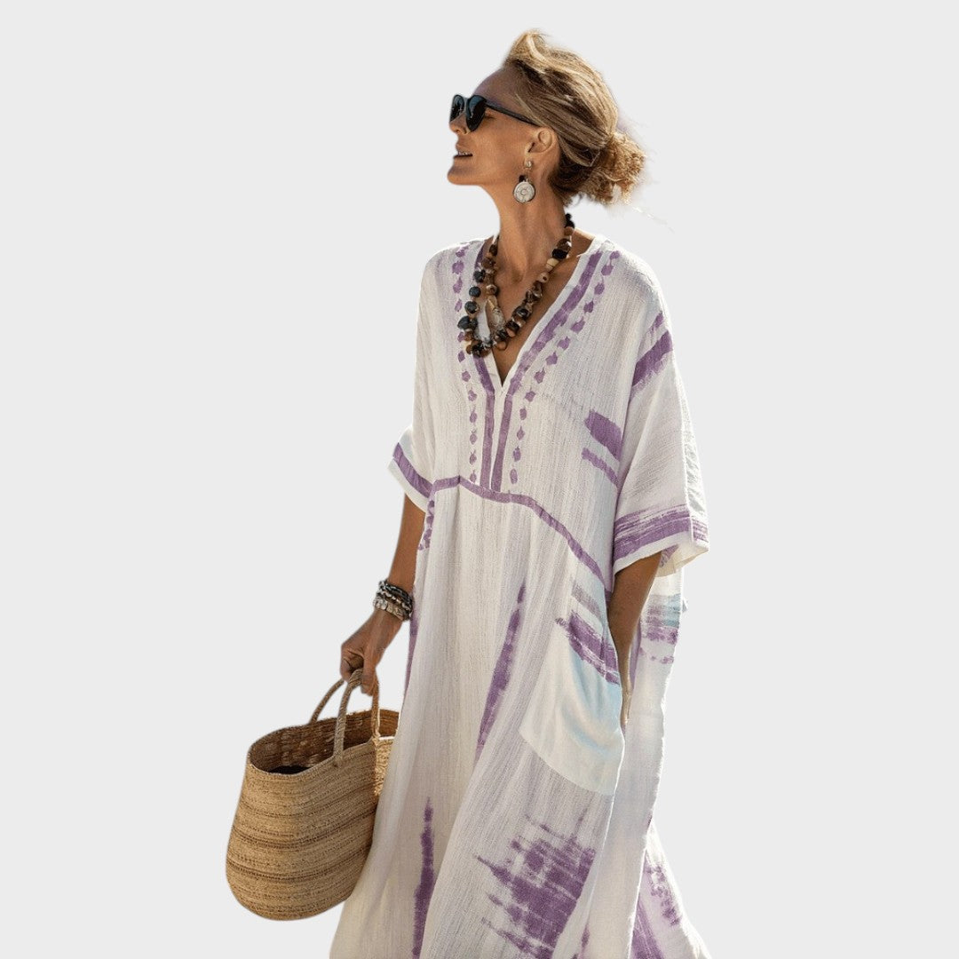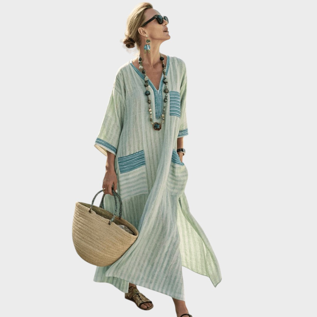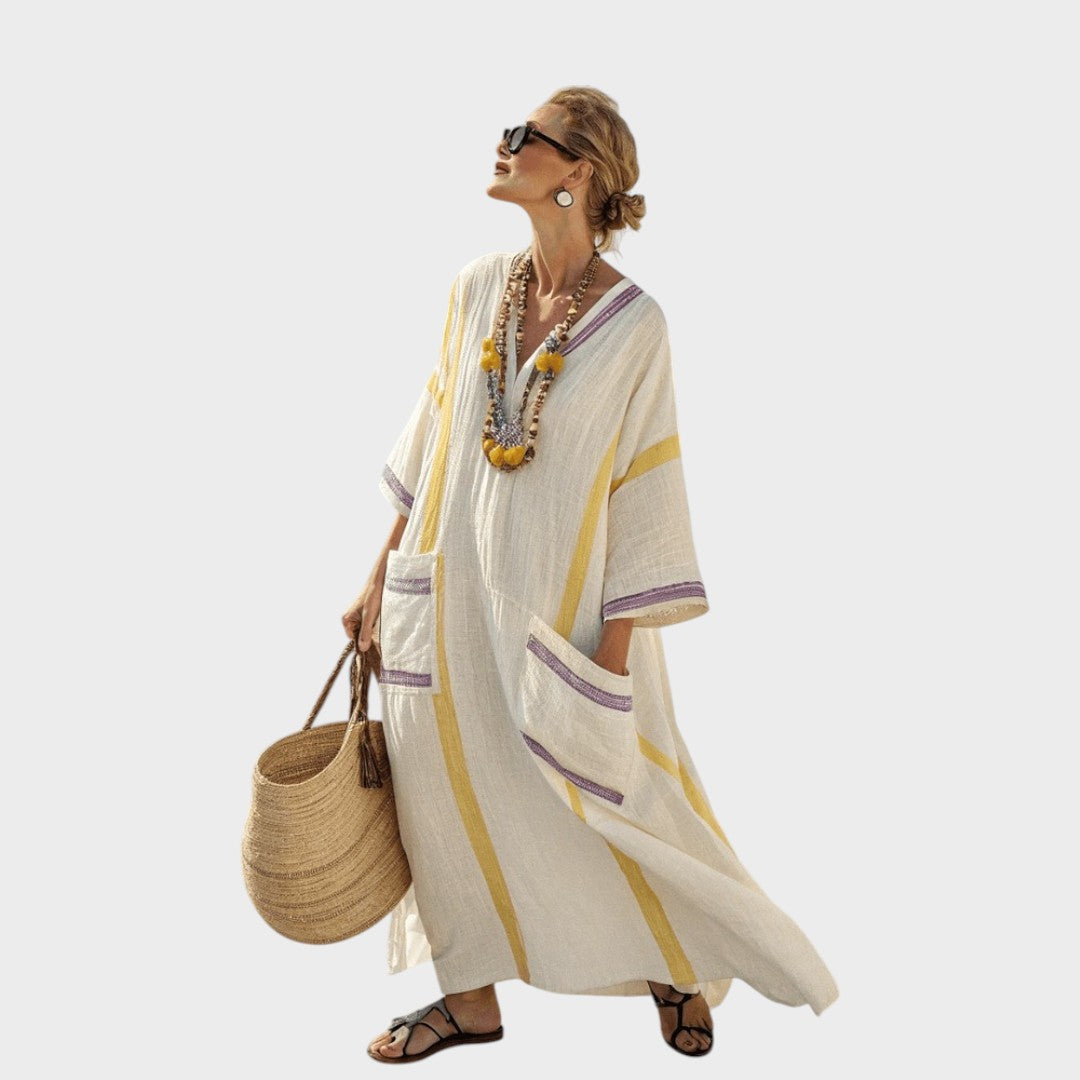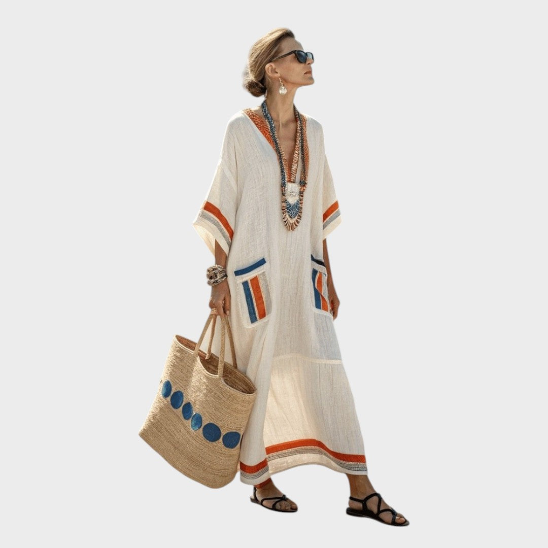 Perfecto para los días soleados, este vestido combina la flexibilidad del algodón con la elegancia natural del lino. El corte holgado favorece cualquier cuerpo y los detalles de color le dan un toque artístico y sofisticado. Ideal para llevarlo en la playa, en la ciudad o en una cena al atardecer.