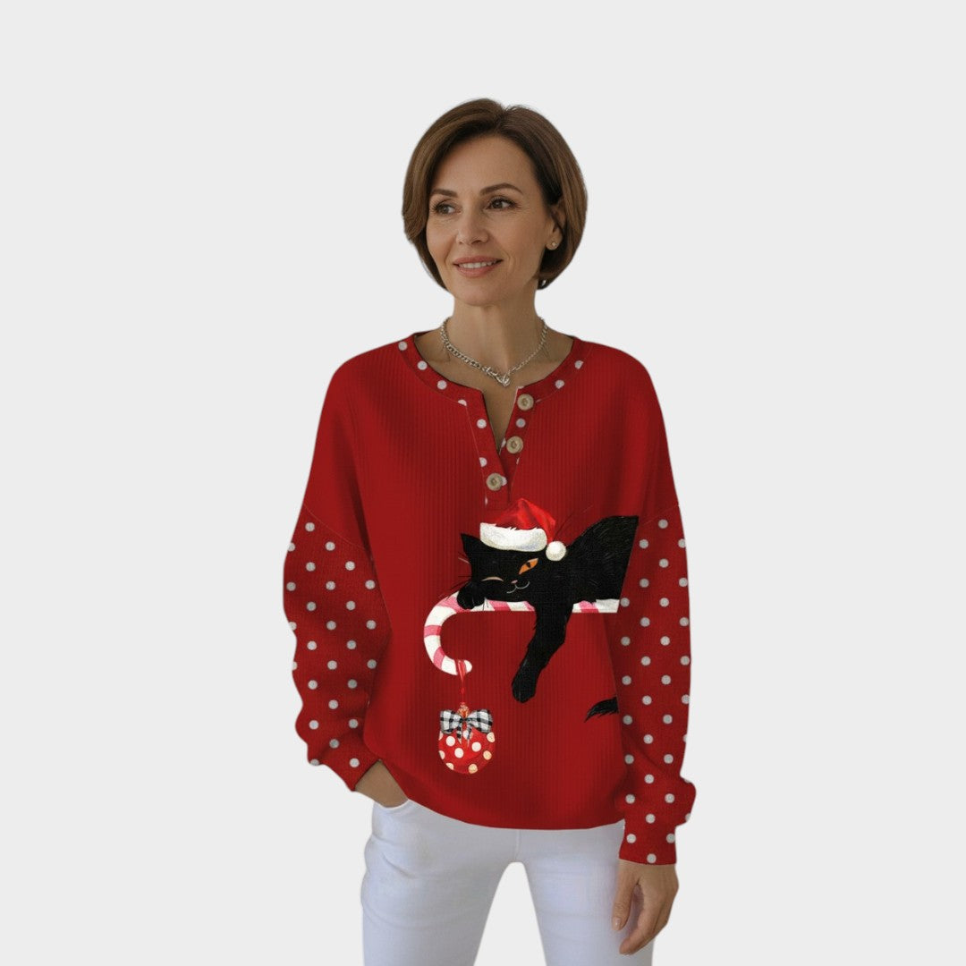 El suéter Mila combina humor y calidez en un solo y encantador diseño. El gato negro con gorro navideño e impresión de bastón de caramelo aporta un toque alegre, mientras que la base roja con puntos blancos evoca el clásico ambiente navideño. Confeccionado en una suave mezcla de algodón tejido, este suéter ofrece comodidad y estilo durante las fiestas.